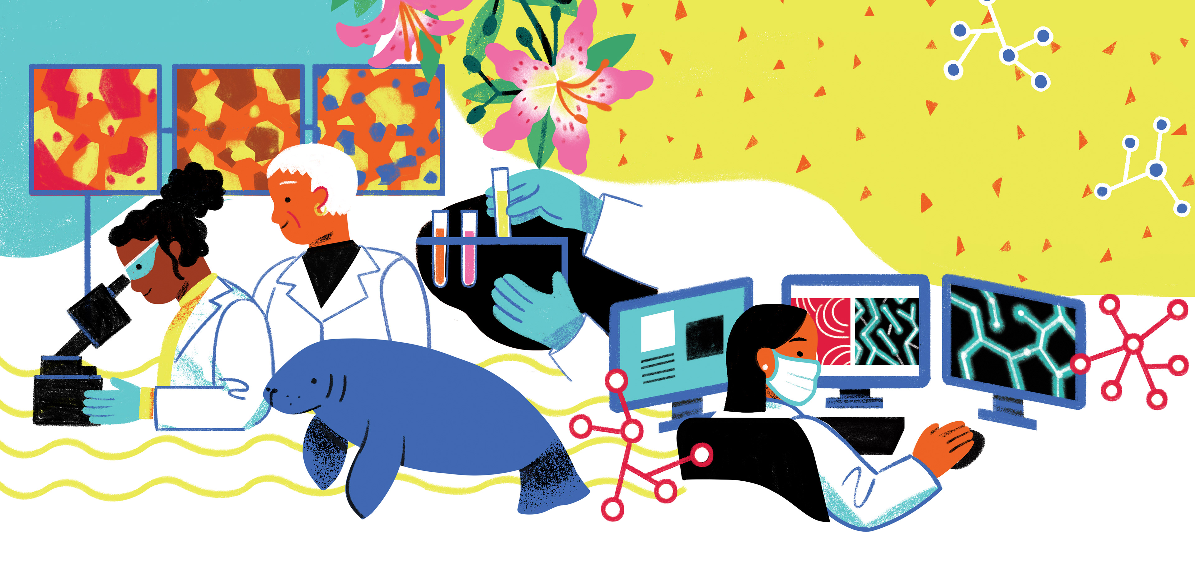 But as it was part of the brief, combining these scientific themes with animals and diverse plant life became a way to create illustrations that feel both organic and fresh. I chose a vibrant color palette that draws inspiration from real-life references, while allowing the scientific elements to integrate naturally with the surrounding landscape.